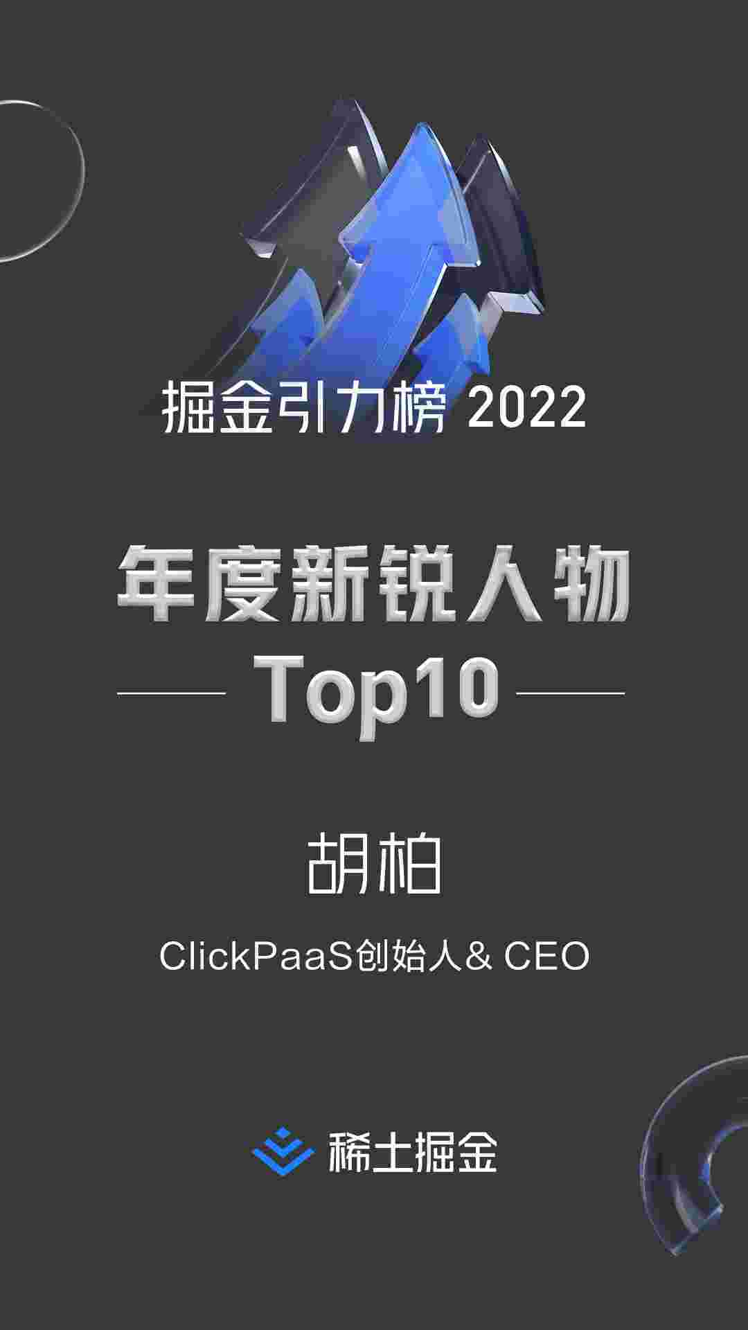 2022年1月6日,,稀土掘金社区第一届「掘金未来大会」成功举办,,会上发布了“2022 稀土掘金引力榜 年度新锐人物”榜单,,,,上海爱湃斯科技有限公司(简称小米钱包)创始人及CEO胡柏实力入选年度新锐人物TOP 10。。